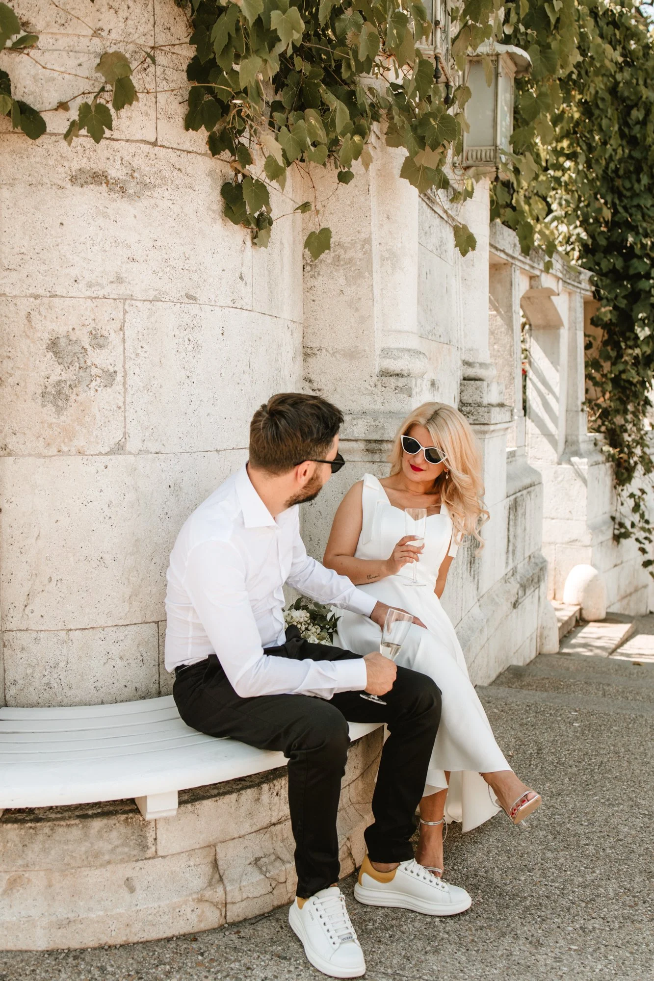 Our first stop was the beautiful Stadtpark, a lush oasis in the middle of the city, where Ioana and Ghenghiu shared a celebratory toast with champagne. With its serene atmosphere, Stadtpark provided a perfect setting for some truly captivating shots. The natural beauty of the park, coupled with the elegance of Ioana and Ghenghiu, resulted in images that exude romance and timelessness. Next, we moved to the area surrounding Albertina, where the couple's sophisticated style perfectly matched the elegance of the setting. The Albertina's architecture provided a stunning contrast to the tender moments we captured, emphasizing the couple's refined taste and deep affection for one another. Our journey concluded at the Burggarten. This was the perfect way to end their post-wedding photo session in Vienna, with the couple enjoying a moment of happiness in one of Vienna's most beautiful locations.